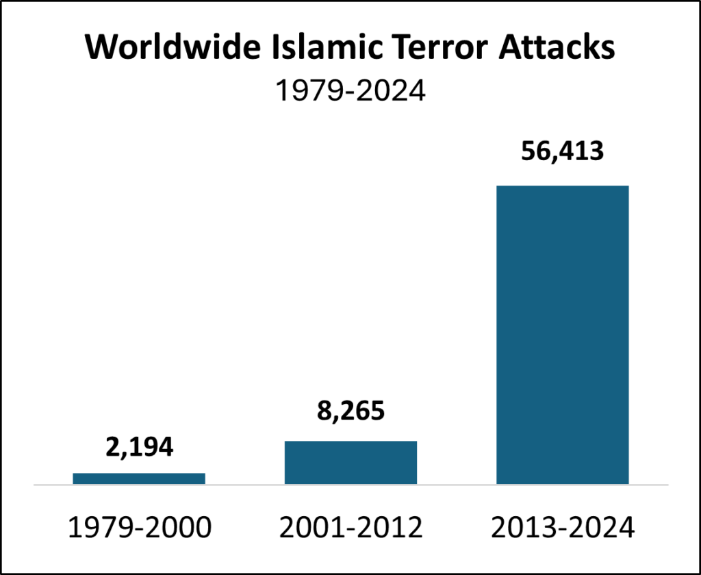 Most of the Briefs here center on Islam because most terror attacks in the world today are traceable to Islamic terror. A French think tank, Fondepol, has tallied 66,872 Islamist terrorist attacks that altogether killed at least 250,000 people between 1979 and 2024. The uptick in their statistics (see chart) forms a historical global tipping point for violence in our time.