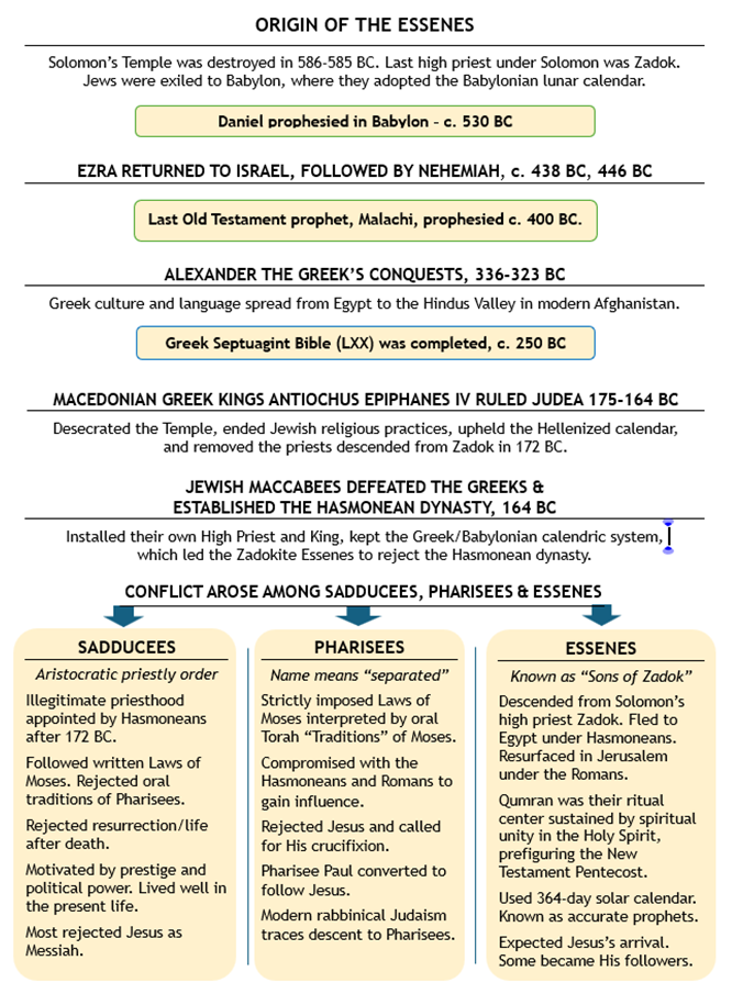 The preceding chart summarizes key historical details related to the Essenes. They descended from Zadok, the last high priest appointed by Solomon, whose temple was destroyed in 586-585 BC. Fast forward to Alexander the Great’s conquests and early death in 323 BC. That led to establishing a Greek “Seleucid Empire” in the eastern Mediterranean region, including Judea. In 168 BC, the Seleucid king Antiochus Epiphanes IV famously desecrated the Temple in Jerusalem, banned Jewish religious practices, and upheld the lunar calendar used throughout Alexander’s former empire in place of Israel’s ancient Temple calendar.